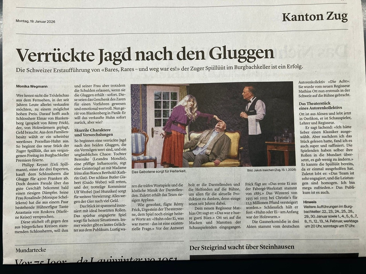 Seit September wird bei den Zuger Spiillüüt mit Hochdruck geprobt und dieses Mal mit einer besonderen Herausforderung: Alle Spieler:innen übertrugen ihre Rollen eigenhändig ins Schweizerdeutsche. Unter den wachsamen Augen des Regisseurs entstand so eine Bühnenfassung, die den Witz und das Tempo des Originals bewahrt und beim Feilen am richtigen Dialektausdruck nicht selten Tränen der Heiterkeit hervorrief. Die Proben verliefen von Anfang an so rasant wie das Stück selbst: Schon nach kurzer Zeit waren die Spieler:innen textsicher und können sich nun mit spürbarer Spielfreude ihren Rollen widmen.